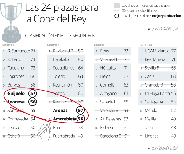 Así que, al igual que la pasada, esta también verá a la misma cifra (24) de equipos de Segunda B jugando el torneo del K.O. Son cinco por cada grupo que se clasifican directamente por posición, es decir, 20; y los otros 4, por puntuación.