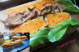 Retiramos la parte de la corteza de la panceta, partiendo cada loncha por la mitad y colocamos una loncha de panceta y dos filetes de lomo sobre una mitad del pan.