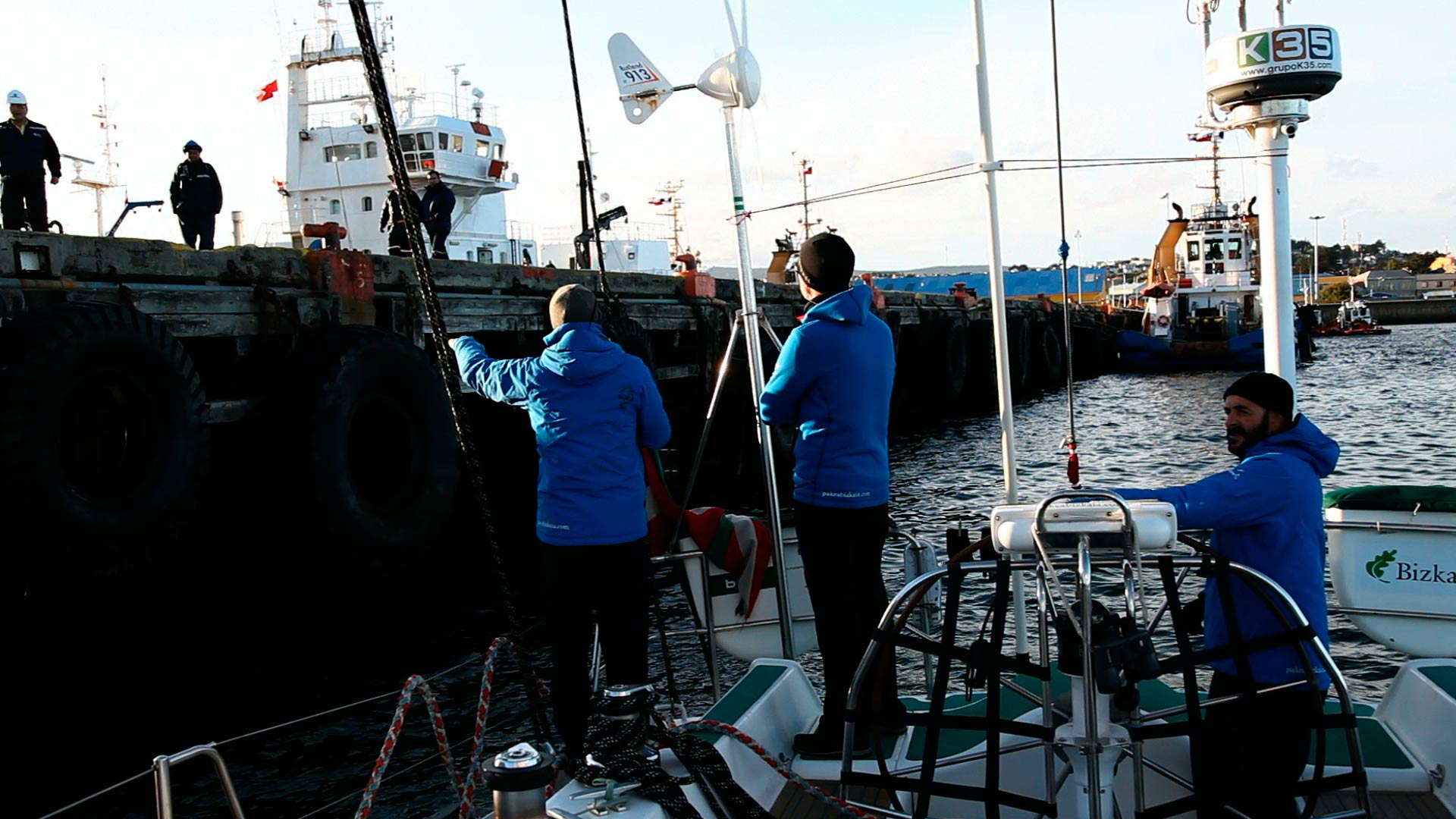 El Pakea Bizkaia arribó el lunes a la noche al Puerto Chileno de Punta Arenas, dentro del Estrecho de Magallanes. A su entrada, grupos de toninas overas y aves marinas acompañaron la velero.